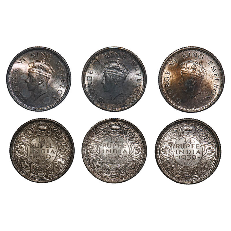 | George VI, Silver, 1/4 Rupee, 1939, (3 coins), 1 & 2) Bombay Mint, Head Type I, Rev I, Dot, Milled edge, 3) Calcutta Mint, Head Type I, Rev I, No dot, Milled edge. F. Prid 461(2), 472. GK 1323(2), 1325. Brilliant Uncirculated. Very Scarce. |