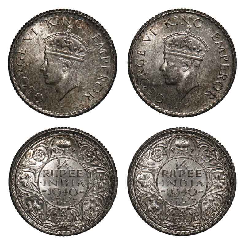 | George VI, Half Silver, 1/4 Rupee, 1940, (2 coins), Calcutta Mint, Head Type II, Rev I, No dot, Milled edge. F. Prid 473(2). GK 1328(2). Brilliant Uncirculated. Scarce. |