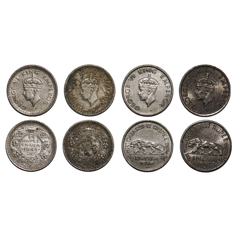 | George VI, Mixmetal, 1/4 Rupee, (4 coins), Bombay Mint, 1) 1944, Half Silver, Head Type II, Rev II, Dot, Security edge, Rev lettering w/o serif, 2) 1945, Half Silver, Head Type II, Rev II, Dot, Security edge, Rev lettering w/o serif, Large 5, 3) 1946, Nickel, Head Type II, Rev IV, Diamond, Milled edge, 4) 1947, Nickel, Head Type II, Rev IV, Diamond, Milled edge. F. Prid 468, 470, 868, 869. GK 1339, 1343, 1346, 1347. Very Fine to About Uncirculated. Scarce. |