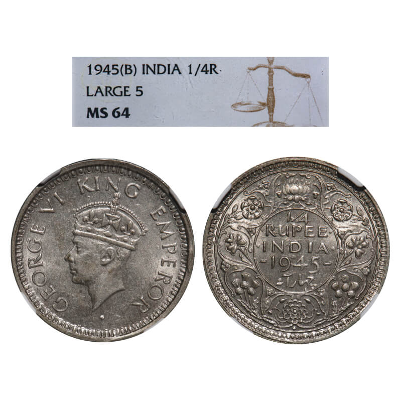 | George VI, Half Silver, 1/4 Rupee, 1945, Bombay Mint, Head Type II, Rev II, Dot, Security edge, Rev lettering w/o serif, Large 5. F. Prid 470. GK 1343. NGC Slabbed MS 64. Extremely Rare. (Only 3 coins graded higher by NGC and none by PCGS in this category till 01/03/2025) |