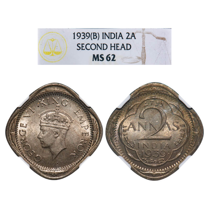 | George VI, Copper-Nickel, 2 Anna, 1939, Bombay Mint, Head Type II, Dots by year. F. Prid 914. GK 1349. NGC Slabbed MS 62. Very Rare. (19 coins graded higher by NGC and 6 by PCGS in this category till 1/3/2025). The Bombay and Calcutta Mints in 1938-39 used the 1st or Young Head with long trefoils on the obverse for their 2 Anna coins. This changed in 1940 when the 2nd or Mature Head with short trefoils replaced the 1st or Young Head in the obverse dies. However, on some occasions, probably towards the end of 1939 when the standard dies broke or replacements were late in arriving, the mature head dies meant for the next year, which had already arrived, were employed, as in the present coin. |