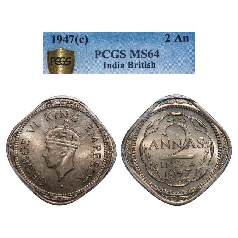 George VI, Copper-Nickel, 2 Annas, 1947, Calcutta Mint, Head Type II, No dots by year. F. Prid Unlisted. GK 1376. PCGS Slabbed MS 64. Very rare. (16 coin graded higher by NGC and 2 by PCGS in this category till 1/3/2025)