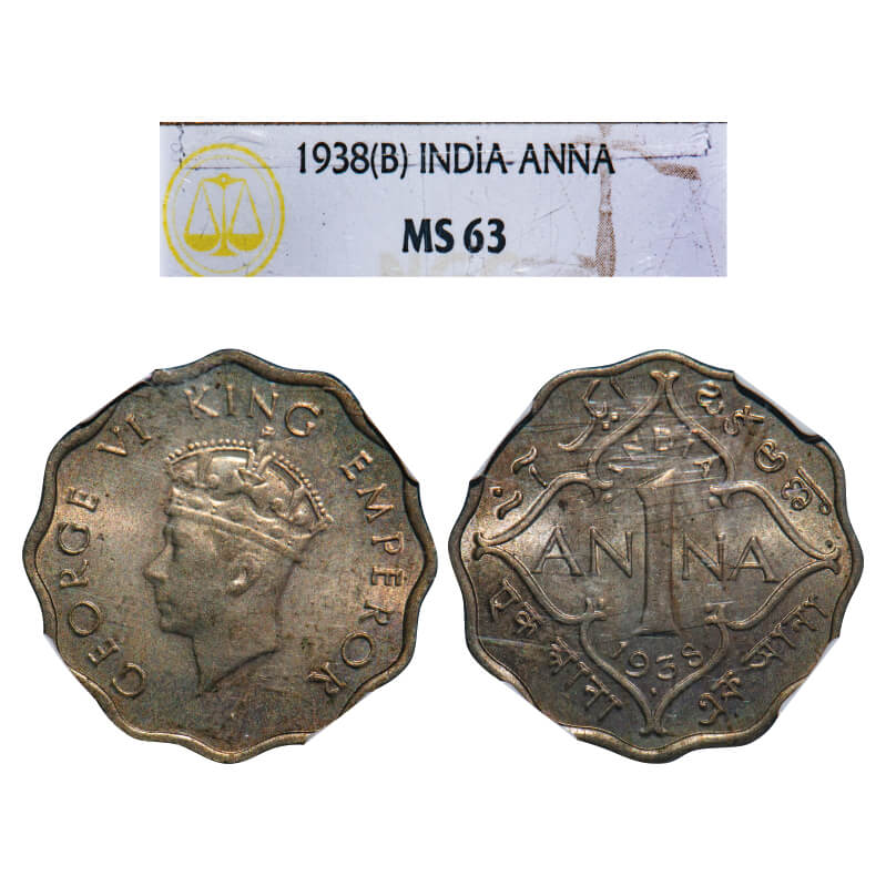 George VI, Copper-Nickel, 1 Anna, 1938, Bombay Mint, Head Type I, Dot. F. Prid 971. GK 1377. NGC Slabbed MS 63. Very Rare. (Only 3 coins graded higher by NGC and none by PCGS in this category till 1/3/2025)
