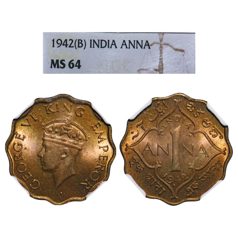 George VI, Nickel-Brass, 1 Anna, 1942, Bombay Mint, Head Type II, Dot. F. Prid 976. GK 1388. NGC Slabbed MS 64. Rare. (10 coins graded higher by NGC and 3 by PCGS in this category till 1/3/2025).