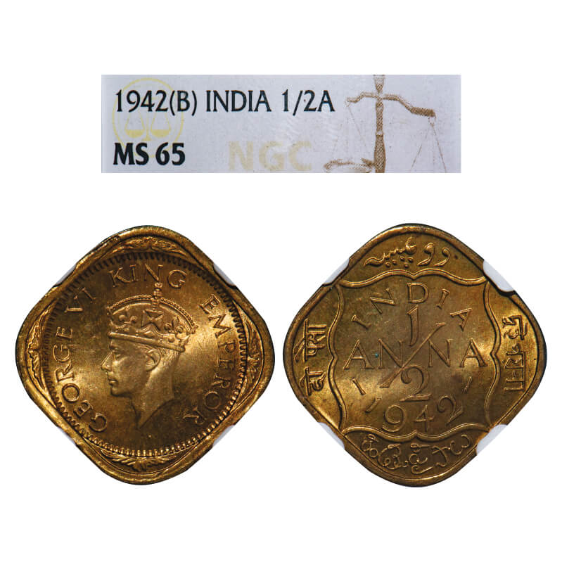 George VI, Nickel-Brass, 1/2 Anna, 1942, Bombay Mint, No dots by India, Dashes by year. F. Prid 990. GK 1404. NGC Slabbed MS 65. Very Rare. (14 coins graded higher by NGC and none by PCGS in this category till 1/3/2025)