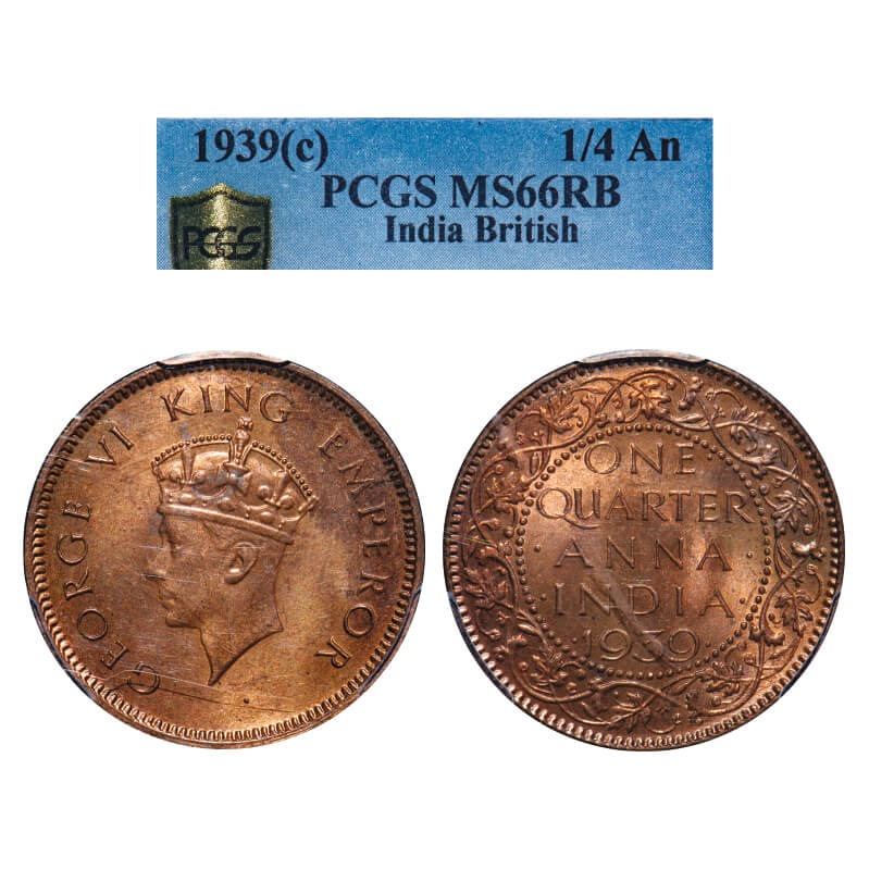 George VI, Bronze, Quarter Anna, 1939, Calcutta Mint, Head Type I, No dot. F. Prid 685. GK 1423. PCGS Slabbed MS 66 RB. Extremely Rare. (Highest Graded Coin in NGC and PCGS in this category till 01/03/2025. None Higher)