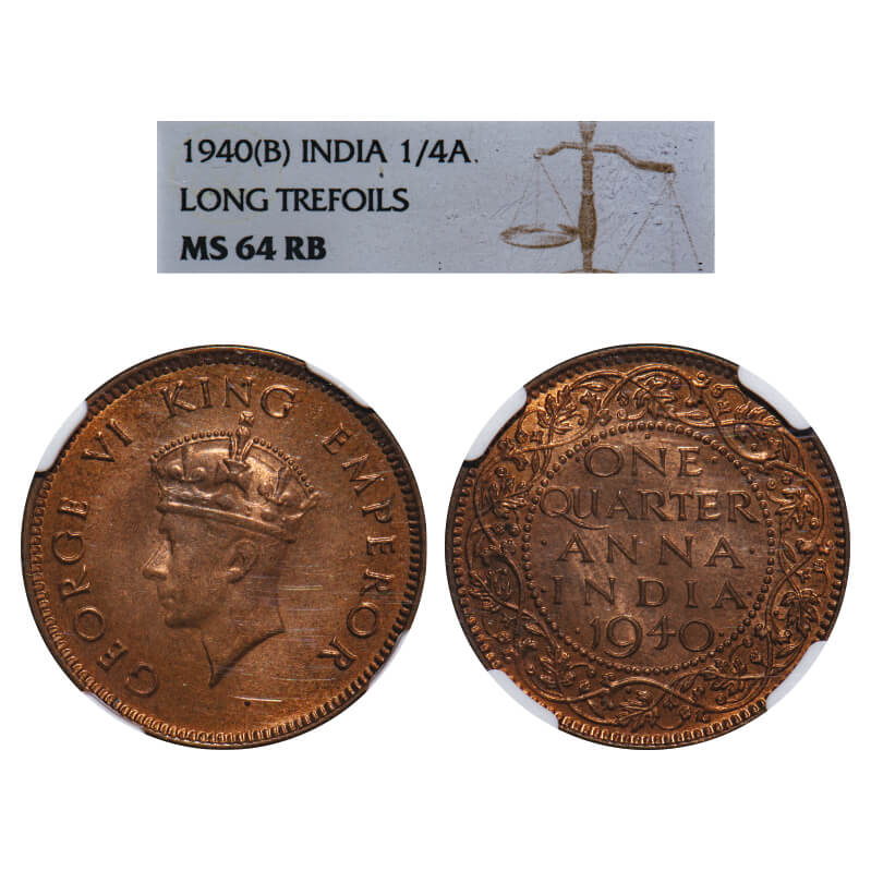 | George VI, Bronze, Quarter Anna, 1940, Bombay Mint, Head Type I, Dot. F. Prid 691. GK 1425. NGC Slabbed MS 64 RB. Very Rare. Young Head, Mule, The Bombay and Calcutta mints in 1938-39 used the 1st or young head with long trefoils on the obverse for their 1/4 Anna coins. This changed in 1940 when the 2nd or mature head with short trefoils replaced the 1st or young head in the obverse dies. However, on some occasions, probably when the standard dies broke or replacements were late in arriving, the older dies of the first or young head were employed, as in the present coin. |