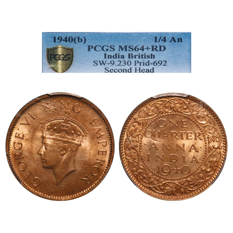 George VI, Bronze, Quarter Anna, 1940, Bombay Mint, Head Type II, Dot. F. Prid 692. GK 1426. PCGS Slabbed MS 64+ RD. Very Rare. (Only 10 coins graded higher by NGC and 18 by PCGS in this category till 1/3/2025)