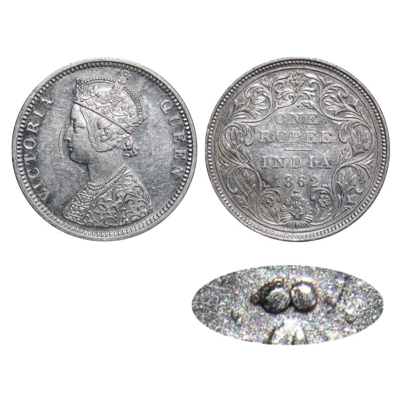Victoria Queen, Silver, Rupee, 1862, Bombay Mint, C/II/1/2, Earlier dies re used by erasing previous dots and inscribing new dots, w/o initial 'J'. F. Prid 105. GK 360. About Uncirculated. Rare.