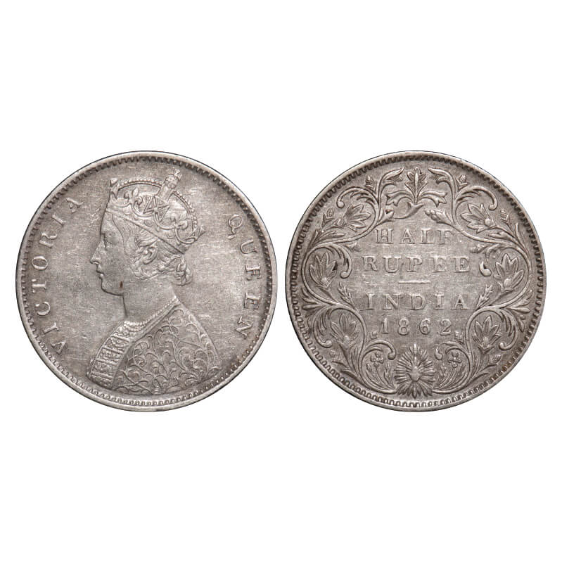Victoria Queen, Silver, Half Rupee, 1862, Bombay Mint, B1/II, Round Pearls, 5 petals has raised veins in the centre of the petals. F. Prid 258. GK 371. Extremely Fine. Very Scarce.