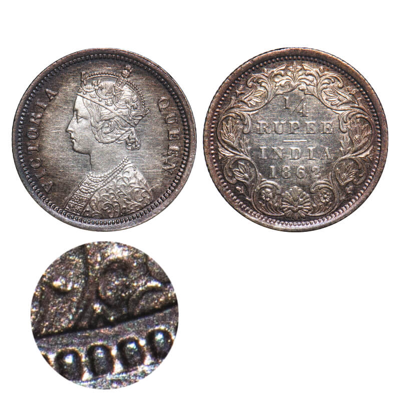 Victoria Queen, Silver, 1/4 Rupee, 1862, Madras Mint, A/I, Queens jabot has 4 complete panels, A small inverted 'V' on the base line of the bust. F. Prid 378. GK 379. Mint State. Very Rare.