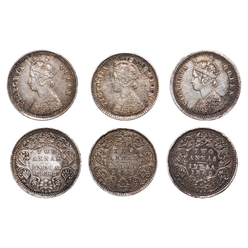 | Victoria Queen, Silver, 2 Annas, (3 coins), 1862, 1) Bombay Mint, A/I, Bottom flower top 3 petals same size, 2 & 3) Madras Mint, A/I, Bottom flower centre top petal broader than left and right connecting petals. F. Prid 486, 487(2). GK 382, 384(2). Extremely Fine to About Uncirculated. Very Scarce. |