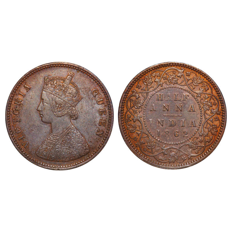 | Victoria Queen, Copper, Half Anna, 1862, Calcutta Mint, B/II, Pineapple like fower buds, Numeral 1 with short horizontal serif, Flat 1. F. Prid 581. GK 388. About Uncirculated. Very Rare. |
