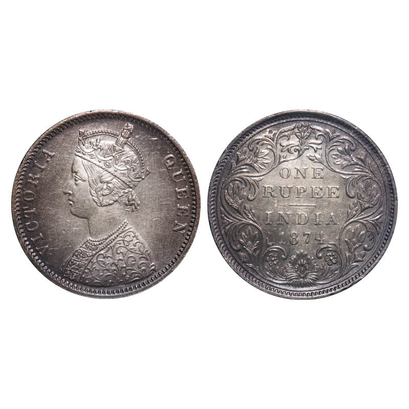 | Victoria Queen, Silver, Rupee, 1874, Bombay Mint, A2/II, No dot, Broken numeral 4, numeral 4 double struck which looks like 4 over 1. F. Prid 142. GK 411. Uncirculated. Rare. |