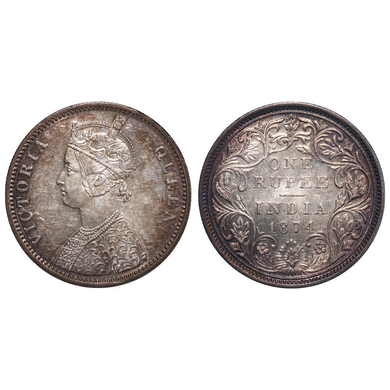 Victoria Queen, Silver, Rupee, 1874, Bombay Mint, A2/II, No dot, Re engraved numeral 4. F. Prid 142. GK 412. Uncirculated. Rare.