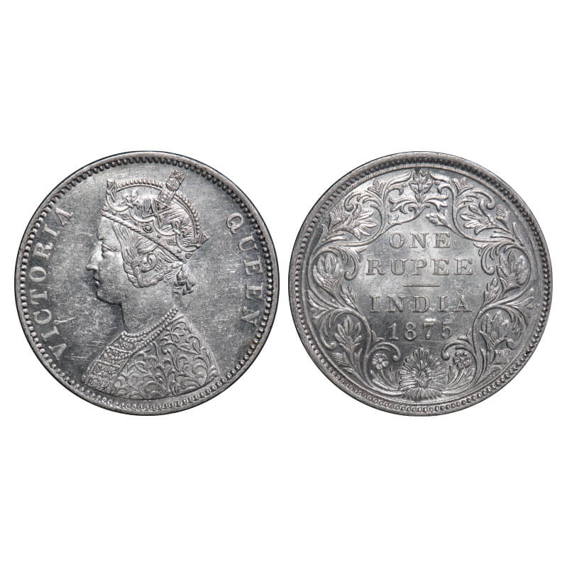 | Victoria Queen, Silver, Rupee, 1875, Bombay Mint, A2/II, Dot, With a 'J' underneath a crescent (Two J's type). F. Prid Unlisted. GK 427 type. Uncirculated, with luster. Rare. |