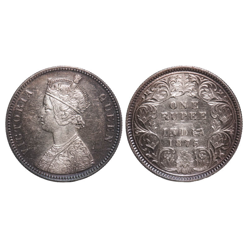 | Victoria Queen, Silver, Rupee, 1875, Calcutta Mint, A1/I, No mint mark, Top stroke of numeral 5 long, Ghost on Rev. F. Prid 113. GK 429. Almost Uncirculated. Very Scarce. |