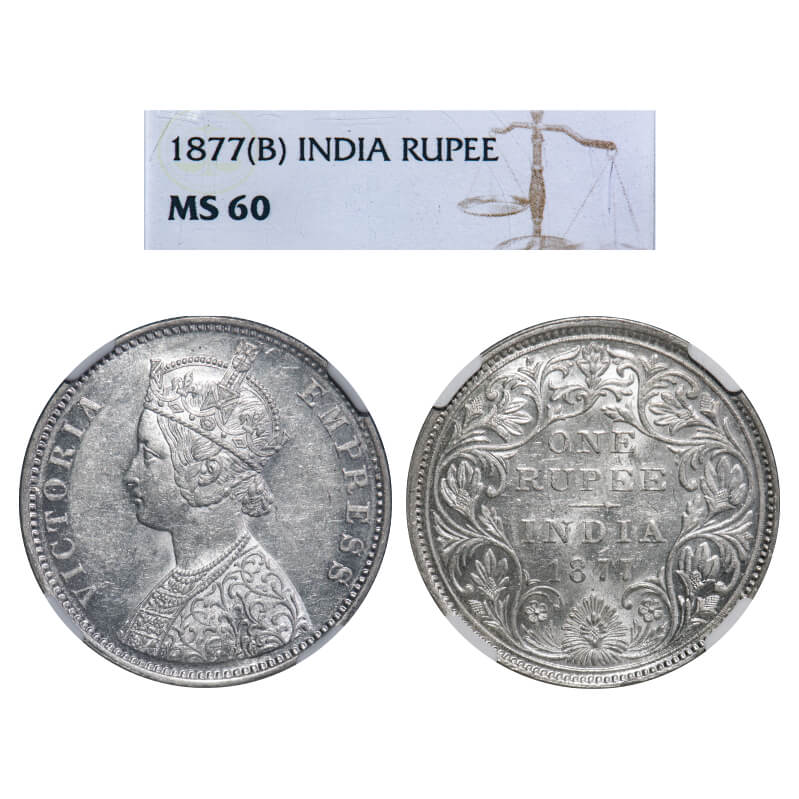 Victoria Empress, Silver, Rupee, 1877, Bombay Mint, A2/II, Dot. F. Prid 149. GK 435. NGC Slabbed MS 60. Rare.