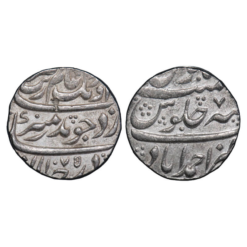 Aurangzeb, Silver Rupee, 11.55g, Ahmadabad Mint, AH 1075/7 RY, complete mint name on reverse bottom. KM 300.2. Uncirculated with luster, Scarce.