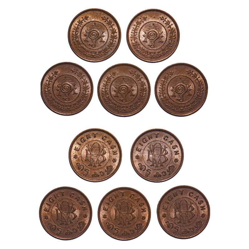 Travancore, Bronze, 8 Cash (5 Coins), 3.90g, Bala Rama Varma II, No Date type (1938-1949 AD). KM 59. Uncirculated, Rare.