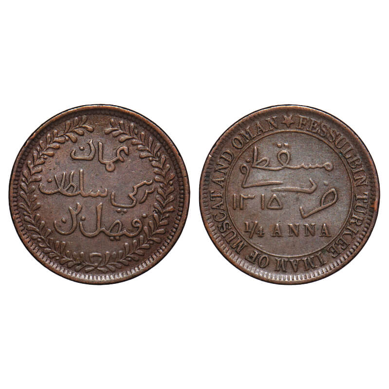 Oman (Muscat & Oman), Copper 1/4 Anna, 5.09g, Faizal Bin Turkee (AH 1306-1332/1888-1913 AD), AH 1315. KM 12.4. About Very Fine, Scarce.