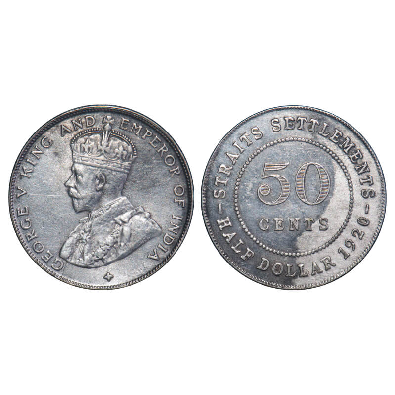 Straits Settelments, Silver (0.500 Silver) 50 Cents, 8.38g, George V, 1920. KM 35.1. Very Fine+, Scarce.