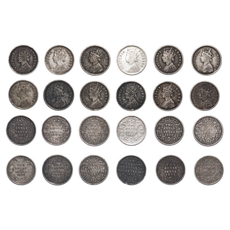| Victoria Queen & Empress, Silver, 2 Annas, (Lot of 12 coins), 1) 1862, Bombay Mint, A/I, Bottom flower centre top petal broader then left and right connecting petals, 2) 1874, Bombay Mint, A/I, No mint mark, No dot, 3) 1875, Calcutta Mint, A/I, No mint mark, 4) 1877, Bombay Mint, A/I, Dot, 5) 1887, Bombay Mint, B/II, 'B' incused, 6) 1888, Bombay Mint, B/II, 'B' incused, 7) 1889, Bombay Mint, B/II, 'B' incused, 8) 1892, Bombay Mint, B/II, 'B' incused, 9 & 10) 1897, Bombay Mint, B/II, 'B' incused, 11) 1900, Bombay Mint, B/I, 'B' raised, Big B, 12) 1901, Calcutta Mint, B/II, 'C' incused. F. Prid 486, Unlisted, 489, 520, 540, 541, 542, 547, 551(2), 553, 515. GK 383, 738, 742, 746, 783, 785, 787, 796, 806(2), 812, 817. Fine+ to Extremely Fine+. Scarce as a lot. |
