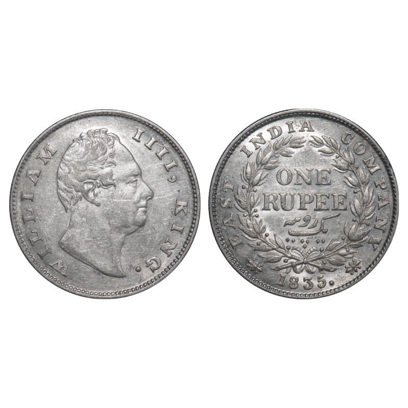William IV, Silver, Rupee, 1835, Calcutta Mint, A/I, 'F' raised, Rev aligned, Large & thick size letters of the legend, With Two leaves above 'E' of One, Wreath with 19 Berries (10L + 9R). F. Prid 37. GK 30. About Uncirculated. Rare. |