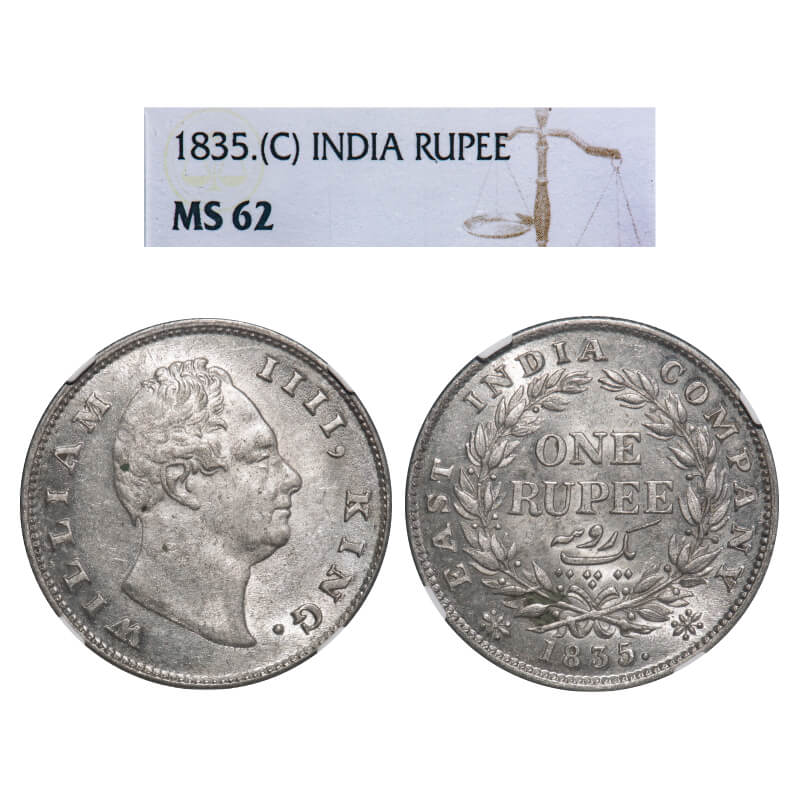 William IV, Silver, Rupee, 1835, Calcutta Mint, A/I, 'F' raised, Large & thick letteres of the legend, Base of 'T' in East is parallel to a leaf tip in the wreath, With Two leaves above 'E' of One, Wreath with 19 Berries (10L + 9R), Rev aligned. F. Prid. GK 30. NGC Slabbed MS 62. Extremely Rare. (34 coins graded higher by NGC in this category till 10/9/2025) |