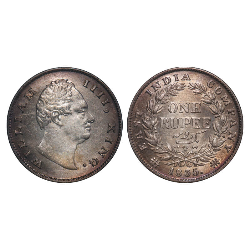 William IV, Silver, Rupee, 1835, Calcutta Mint, A/I, 'F' raised, Rev aligned, Large & thick letters of the legend, Base of 'T' in East is parallel to a leaf tip in the wreath, With Two leaves above 'E' of One, Wreath with 19 Berries (10L + 9R). F. Prid. GK 30. Almost Uncirculated. Rare. |