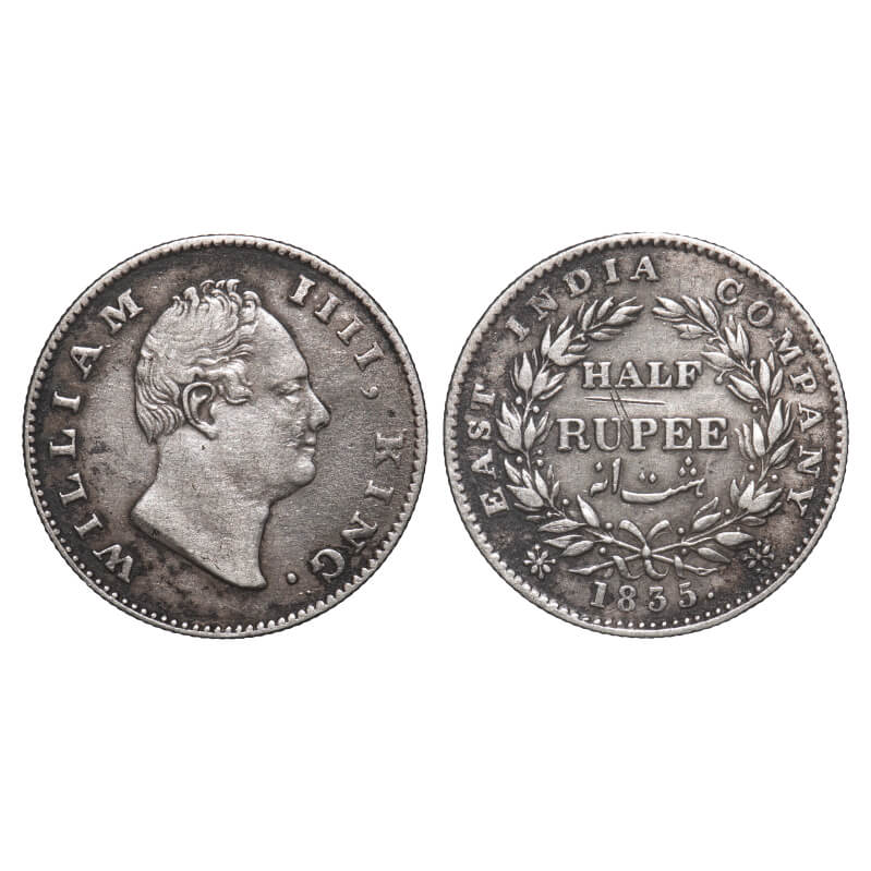 William IV, Silver, Half Rupee, 1835, Calcutta Mint, A/I, 'F' incused, Large and thick sized letters of the legend, Wreath with 21 Berries (11L + 10R). F. Prid 68. GK 38. Very Fine. Rare. |