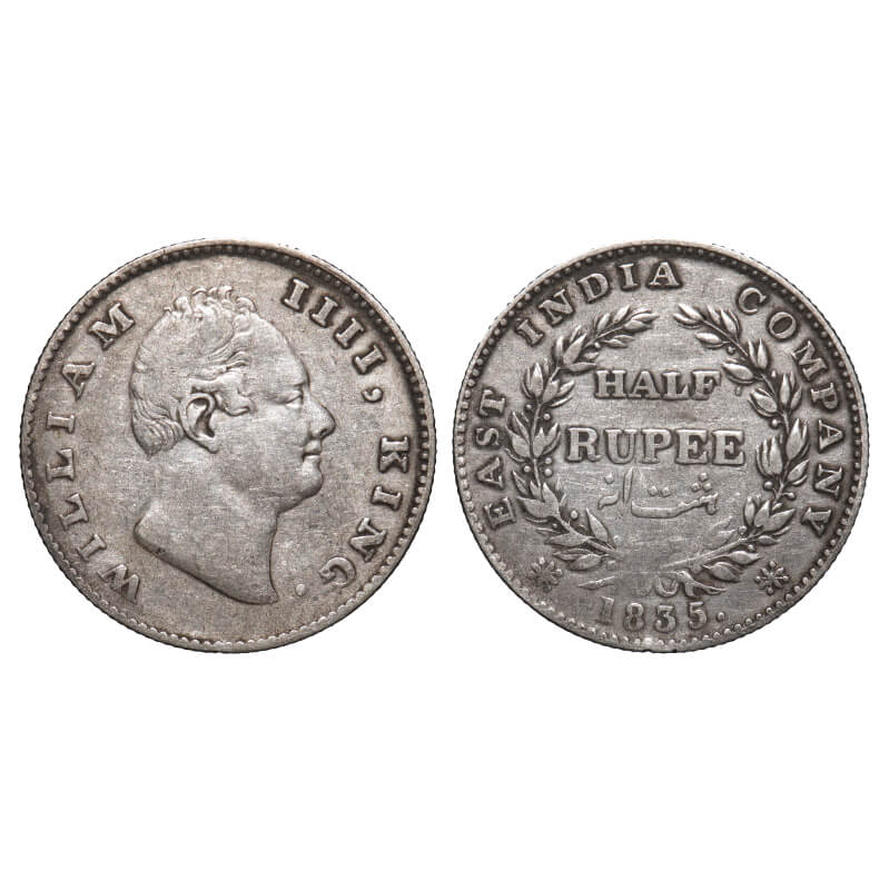 William IV, Silver, Half Rupee, 1835, Calcutta Mint, A/I(ii), 'F' incused, Large and thick sized letters of the legend, With Two leaves above F of Half away from branch, Wreath with 20 Berries (10L + 10R). F. Prid 69. GK 41. Very Fine. Rare. |