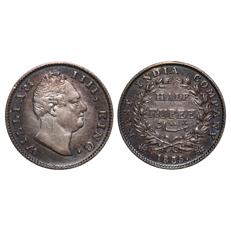 William IV, Silver, Half Rupee, 1835, Calcutta Mint, A/II, 'F' raised, Large and thick sized letters of the legend, With Two leaves above F of Half, Wreath with 19 Berries (9L + 10R). F. Prid 71 GK 49. Very Fine+, Toned. Very Rare. |