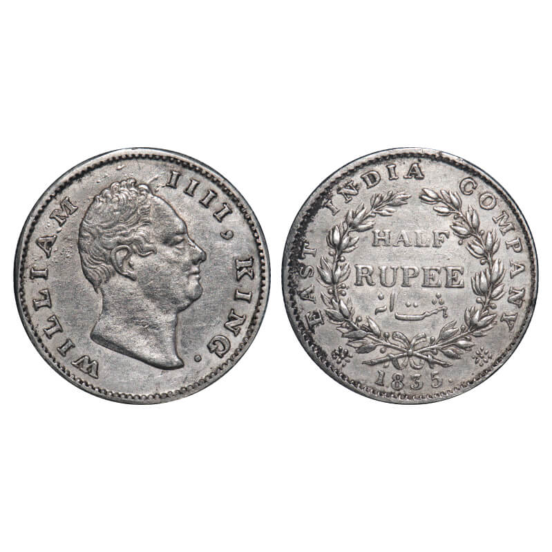 William IV, Silver, Half Rupee, 1835, Calcutta Mint, A/II, 'F' raised, Large and thick size letters of legend, Almost 1'o clock on Rev, With Two leaves above 'F' of Half, Wreath with 20 Berries (10L + 10R), Two leaves above 'F' of Half away from branch. F. Prid. 72. GK 50. Extremely Fine. Rare. |