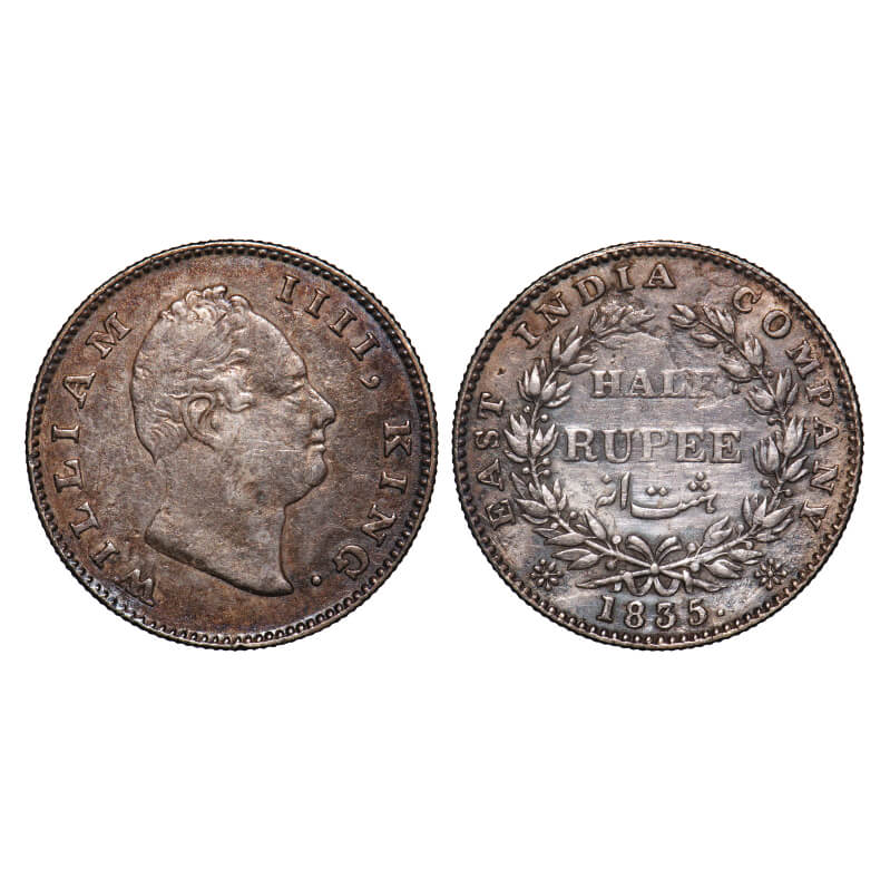 William IV, Silver, Half Rupee, 1835, Bombay Mint, A/I(ii), No initials, Two leaves above 'F' of Half away from branch, Large & thick size letters of the legend, Wreath with 20 Berries (10L + 10R). F. Prid. GK 50. About Very Fine. Very Scarce. |
