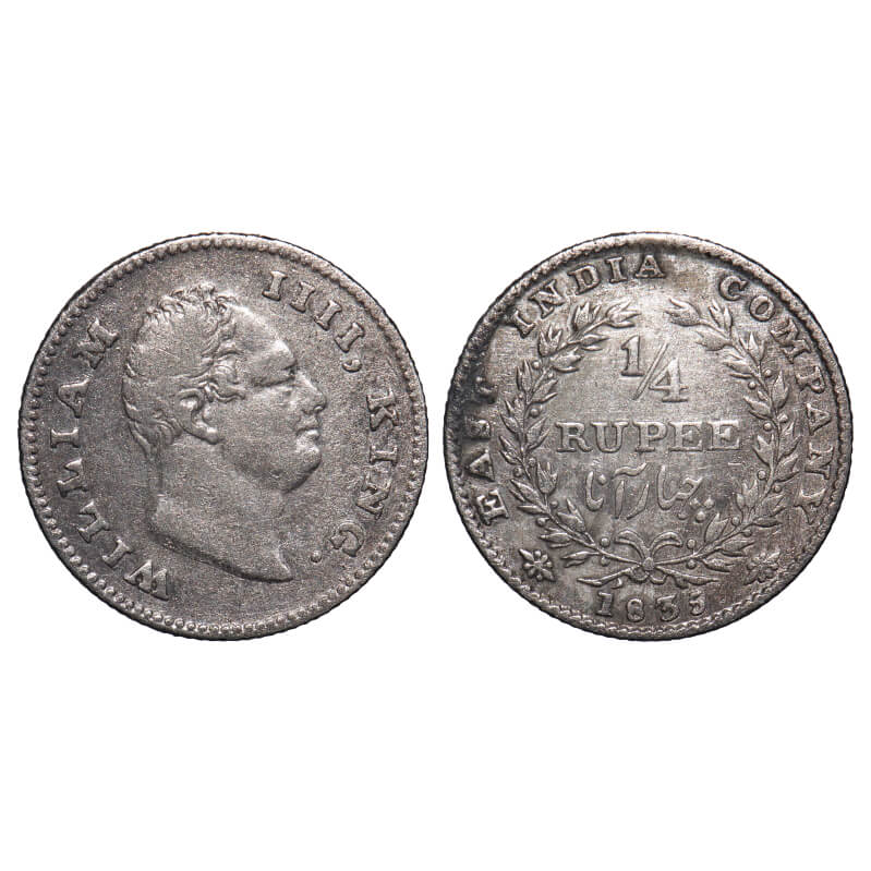 William IV, Silver, 1/4 Rupee, 1835, Calcutta Mint, B/I, R.S. incused, Medium thin sized letters of the legend, Error Hindi variety, Persian inscription reads as Chahaar Aanaa, Thick and crudish numerals of year date 1835, Especially numeral 3 is different, Small & thin year numerals, No dot after year, Wreath with 20 Berries (10L + 10R). F. Prid 85 GK 51. Very Fine+. Rare. |