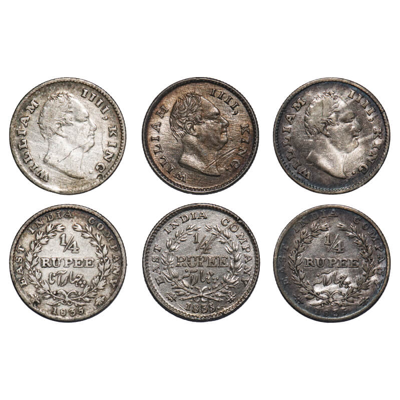 William IV, Silver, 1/4 Rupee, (3 coins) 1835, 1) Calcutta Mint, B/I, R. S. incused, Medium thin size letters of the legend, Wreath with 20 Berries (10L + 10R), Error, Persian inscription reads as 'Chahaar Aanaa' (Hindi variety), 2) Calcutta Mint, A/I, 'F' incused, Large & thick size letters of the legend, Wreath with 19 Berries (9L + 10R), 3) Calcutta Mint, A/III, 'F' raised, Large & thick size letters of the legend, Wreath with 18 Berries (10L + 8R). F. Prid 85. GK 51, Unlisted, 63. Fine+ to Very Fine+. Very Scarce. |