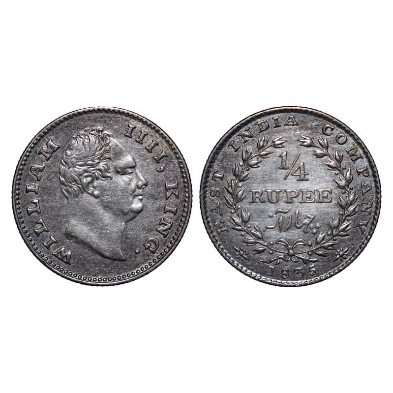 William IV, Silver, 1/4 Rupee, 1835, Calcutta Mint, A/I, 'F' incused, Large & thick size letters of the legend, Wreath with 20 Berries (10L + 10R), No dot after year date. F. Prid. GK 55. About Uncirculated. Rare. |
