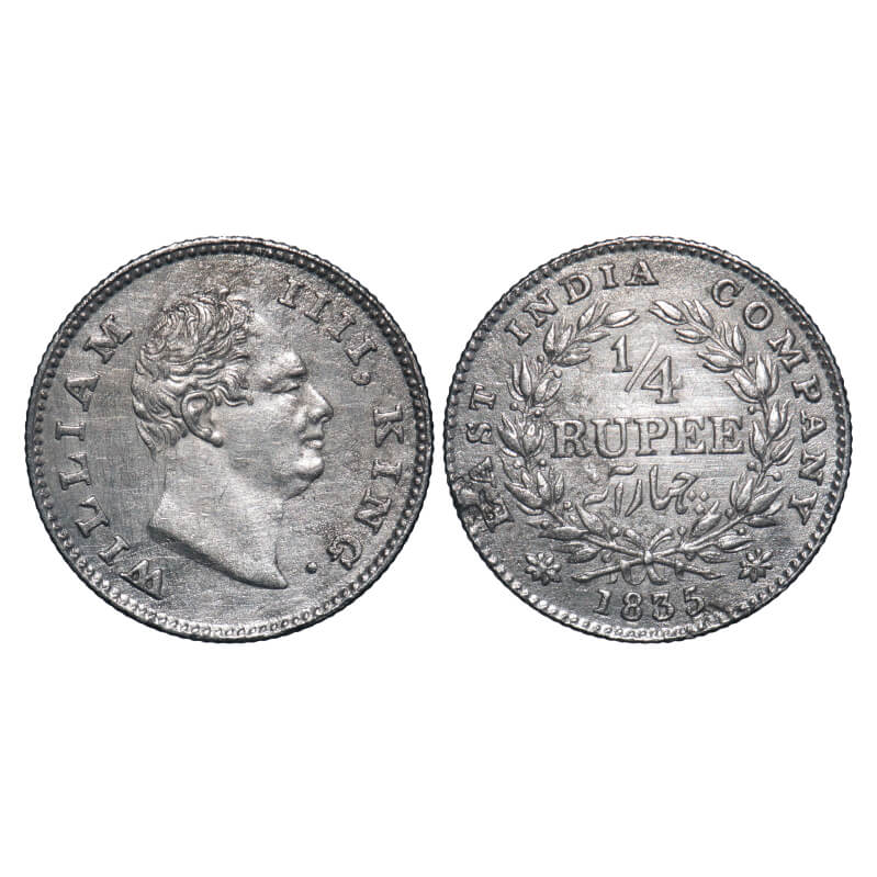 William IV, Silver, 1/4 Rupee, 1835, Calcutta Mint, A/II, 'F' incused, Large & thick letters of the legend, Large year numerals, No dot after year, No serif on top of 'P' in Rupee, Wreath with 19 Berries (10L + 9R). F. Prid 89. GK 57. Extremely Fine. Rare. |