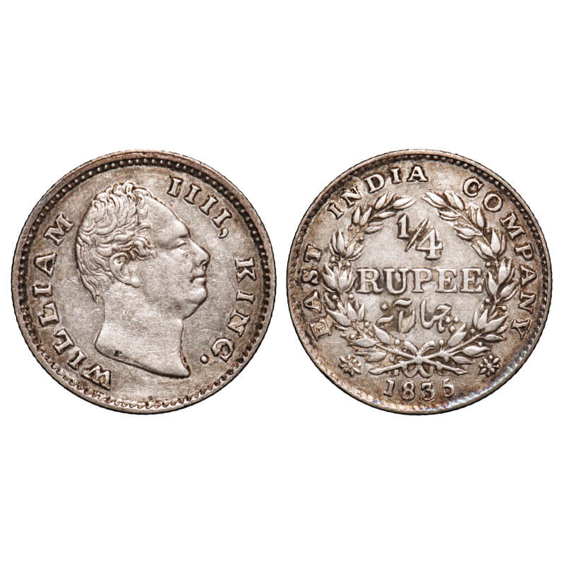 William IV, Silver, 1/4 Rupee, 1835, Calcutta Mint, A/II, Dugout f, Large & thick size letters of the legend, Wreath with 19 Berries (10L + 9R). F. Prid Unlisted. GK 60. Very Fine+. Very Scarce. |