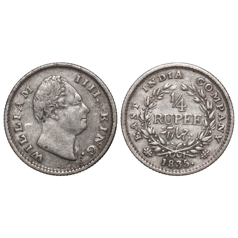 William IV, Silver, 1/4 Rupee, 1835, Calcutta Mint, A/III, Dugout f, Large & thick letters of the legend, Large year numerals, Dot after year, Wreath with 18 Berries (10L + 8R). F. Prid Unlisted. GK 61. Very Fine+. Rare. |