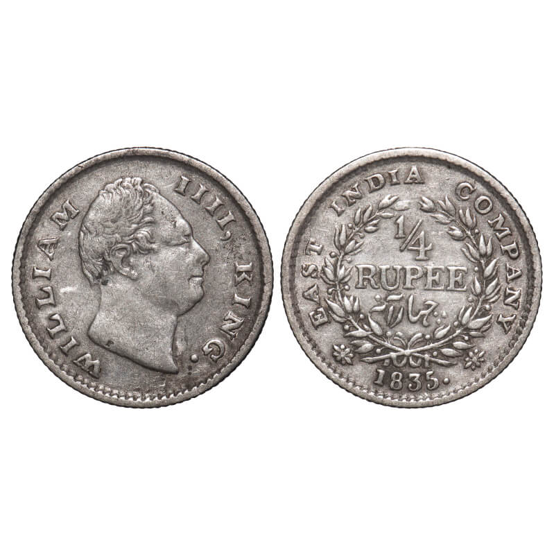 William IV, Silver, 1/4 Rupee, 1835, Calcutta Mint, A/III, 'F' raised, Large & thick letters of the legend, Large year numerals, Dot after year, Wreath with 18 Berries (10L + 8R). F. Prid 91. GK 63. Extremely Fine. Rare. |