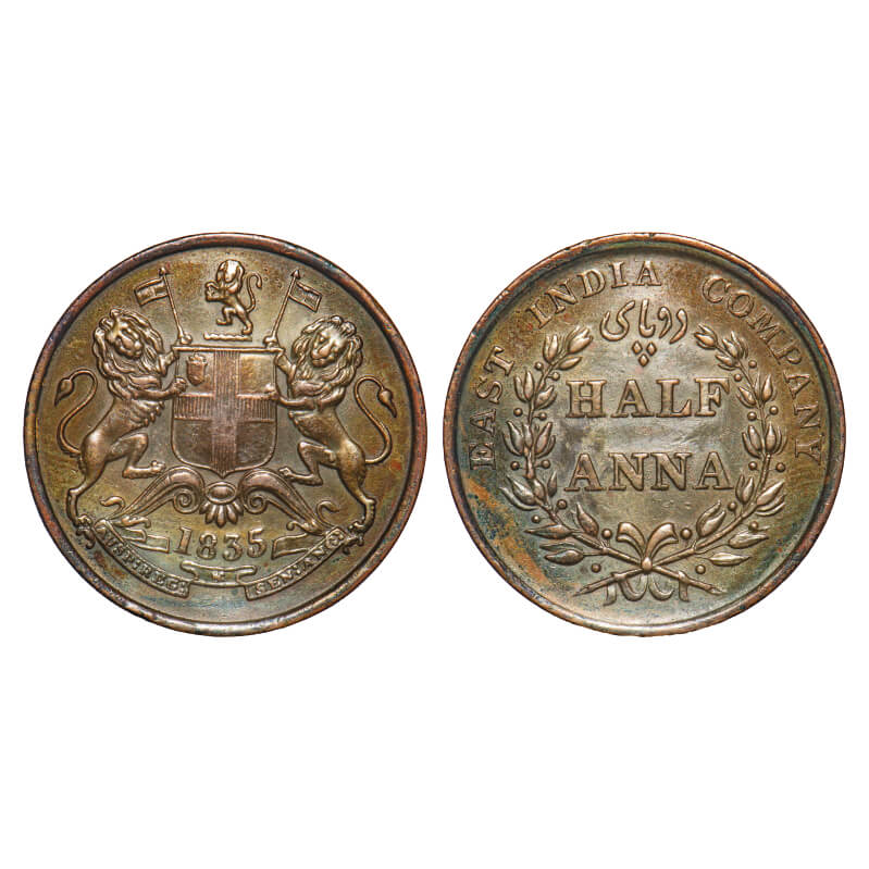William IV, Copper, Half Anna, 1835, Madras Mint, Small Berries, Wreath with 20 Berries (10L + 10R). F. Prid 133. GK 66. Extremely Fine, Toned. Very Scarce.