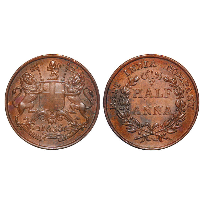 William IV, Copper, Half Anna, 1835, Madras Mint, Large Berries, Wreath with 20 Berries (10L + 10R), Multiple die cracks on Rev. F. Prid 133. GK 67. Extremely Fine+. Very Scarce.