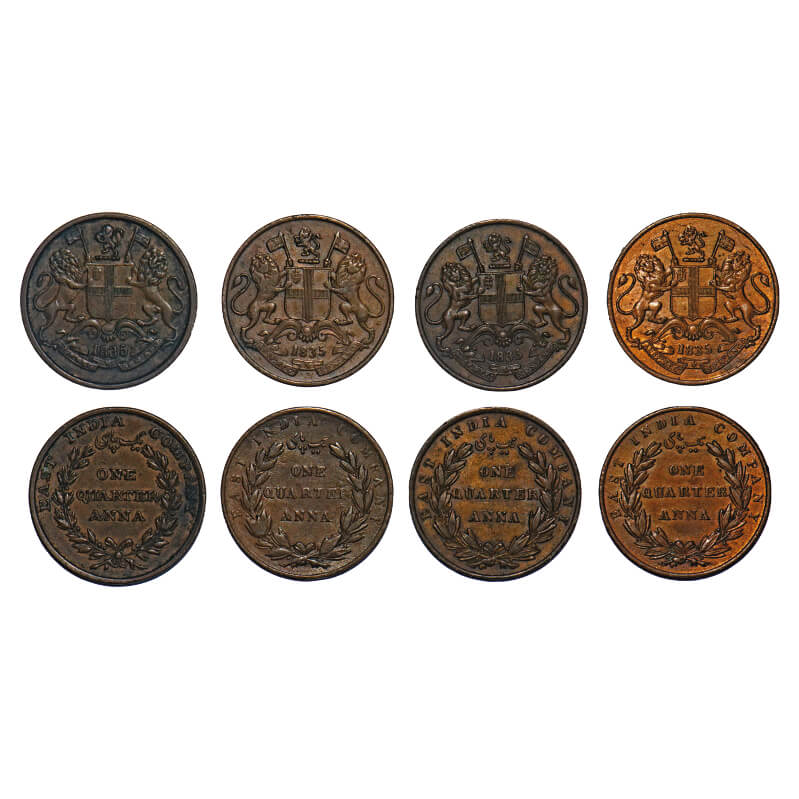 William IV, Copper, Quarter Anna, (4 coins), 1835, 1) Calcutta Mint, A/I, Rev aligned, Large numerals of year, Numeral 1 has oblique top serif, Wreath with 17 Berries (8L + 9R), Wreath tips ends with 3 leaves, 2, 3 & 4) Madras Mint, B/V, Small numerals of year, Numeral 1 has a short horizontal serif, Wreath with 24 Berries (13L + 11R), Short ribbon bow, Wreath tips ends with 3 leaves. F. Prid 148, 144(3). GK 69, 152(3). Extremely Fine to About Uncirculated. Very Scarce. |