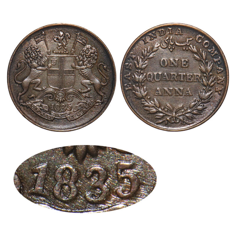 William IV, Copper, Quarter Anna, 1835, Madras Mint, A/II, Large numerals of year, Wreath with 18 Berries (9L + 9R), Shadow impression of year date 1835. F. Prid. 142. GK 73. Almost Uncirculated. Rare. |