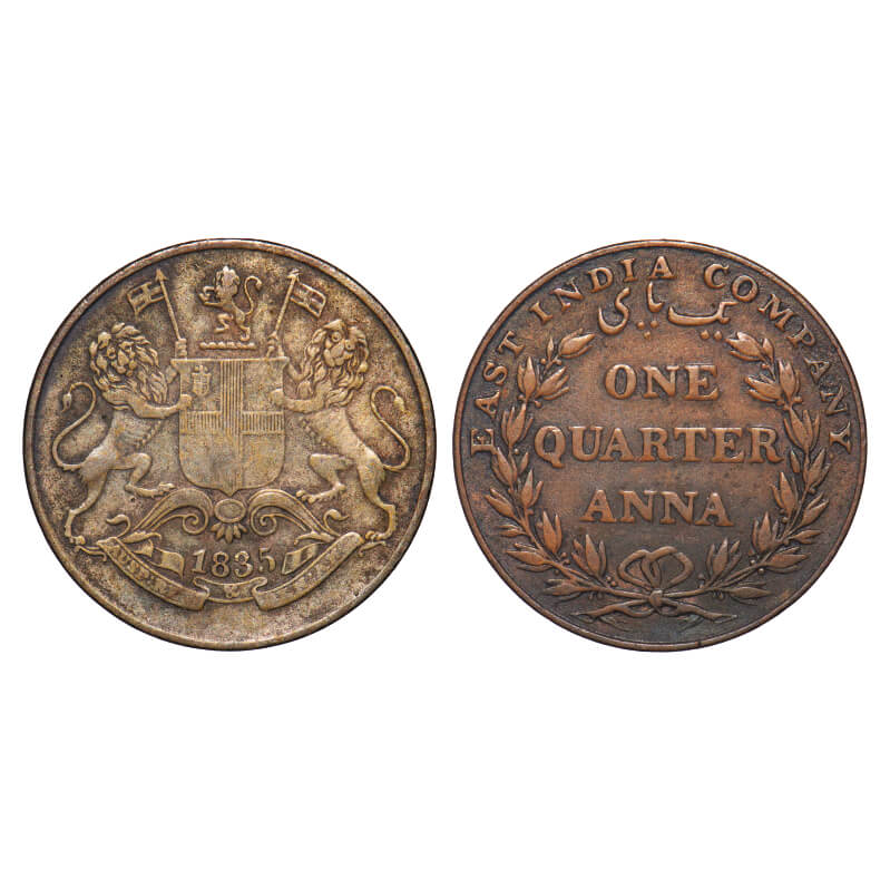 William IV, Copper, Quarter Anna, 1835, Bombay Mint, A/VIII, Large numerals of year, Numeral 1 has a oblique top serif, Wreath with 30 Berries (15L + 15R), A small raised dot below 'Y' in Company, Large loops of ribbon bow, Down swing of numeral 5 broken. F. Prid 140. GK 146. About Very Fine. Very Rare. |