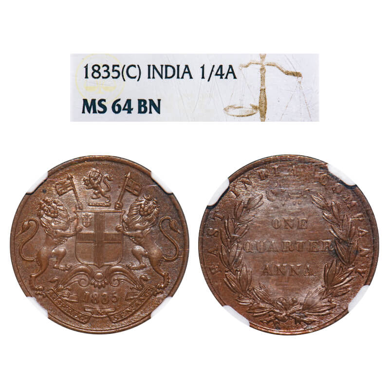 William IV, Copper, Quarter Anna, 1835, Madras Mint, B/V, Small numerals of year, Numeral 1 of year has a short horizontal serif, Wreath with 24 Berries (13L + 11R), Short ribbon bow. F. Prid 145. GK 152. NGC Slabbed MS 64 BN. Extremely Rare. (9 coins graded higher by NGC in this category till 10/9/2025) |