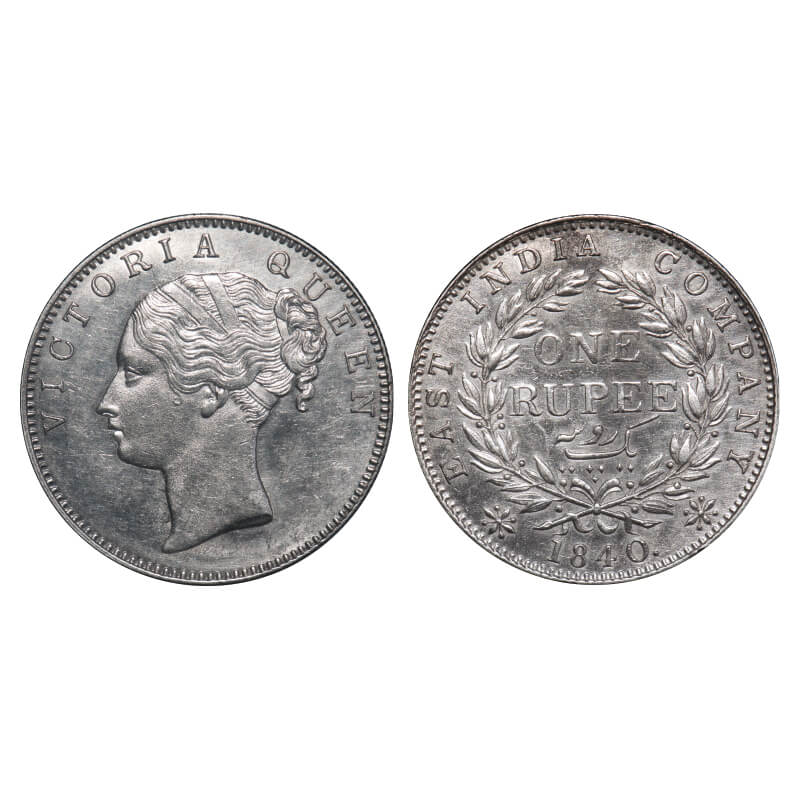 | Victoria Queen, Silver, Rupee, 1840, CL, Calcutta Mint, A/II, English Head, With bud leaves above 'O' & 'E' of One, Wreath with 19 Berries (10L + 9R). F. Prid 42. GK 82. Almost Uncirculated. Rare. |