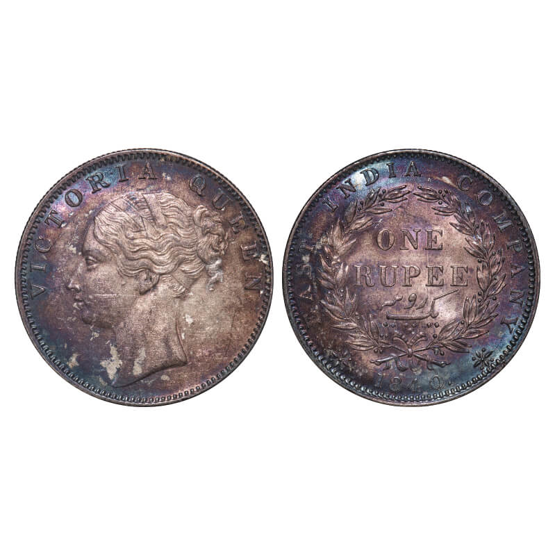 | Victoria Queen, Silver, Rupee, 1840, CL, Calcutta Mint, B/VI, With 'M' incused, English Head with modified features, Wreath with 35 Berries (20L + 15R), With Tiny Berry opposite 'O' of One. F. Prid Unlisted. GK 92. Almost Uncirculated, Toned. Very Scarce. |